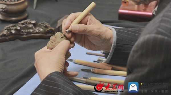 大眾網·海報新聞記者前往聊城臨清漢民青銅藝術品工作室進行了探訪。還未踏入工作室,“叮叮當當”的鍛刻聲不絕于耳,王漢民正在聚精會神進行銅雕鏨刻,工作室內擺放著一件件已經鍛造出精美的紋飾藝術品,讓人目不轉睛。1979年8月,王漢民考入山東工業大學第二機械系鑄造專業,從此便與青銅器結下了深深的緣分,多年來的工作與學習,讓他積累了大量的青銅器制作的第一手資料和實際生產經驗。