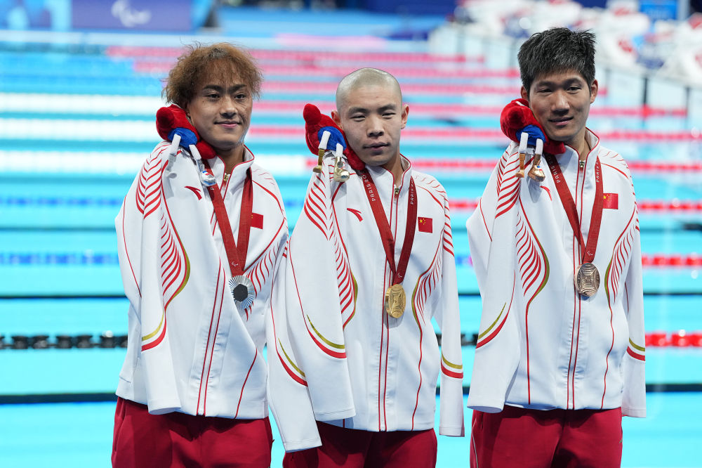 2024年9月6日,在巴黎殘奧會游泳男子50米蝶泳S5級決賽中,中國選手郭金城(中)、袁偉譯(左)、王李超包攬?jiān)擁?xiàng)目冠亞季軍。新華社記者 熊琦 攝