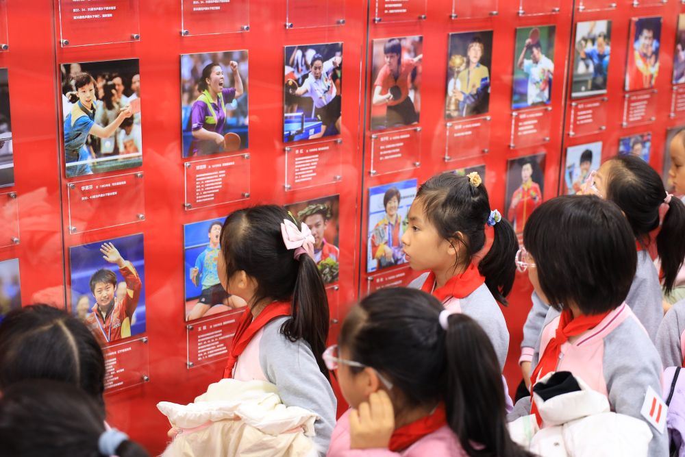 中關(guān)村第三小學(xué)的學(xué)生們參觀乒乓球館內(nèi)的“冠軍榮譽(yù)墻”