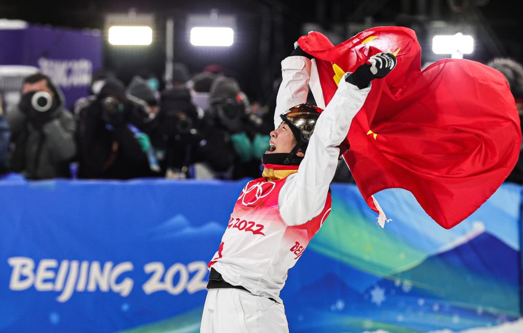 2022年2月14日,徐夢桃頂住名將考德威爾和勞拉·皮爾的沖擊,為中國隊贏下歷史首枚女子空中技巧冬奧金牌。賽后,徐夢桃身披國旗跪倒在雪地里,她淚流滿面轉身嘶吼的畫面無比令人動容。