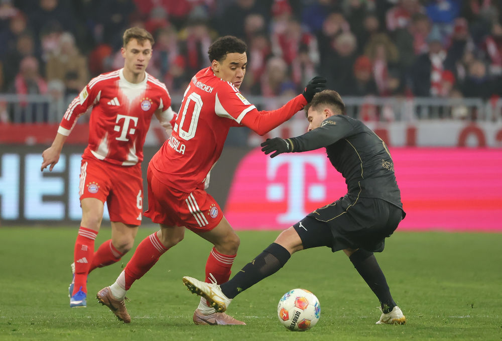 1月24日,拜仁慕尼黑隊球員穆西亞拉(中)和奧格斯堡隊球員雷治貝察伊(右)在比賽中拼搶。新華社發(菲利普·魯伊茲攝)