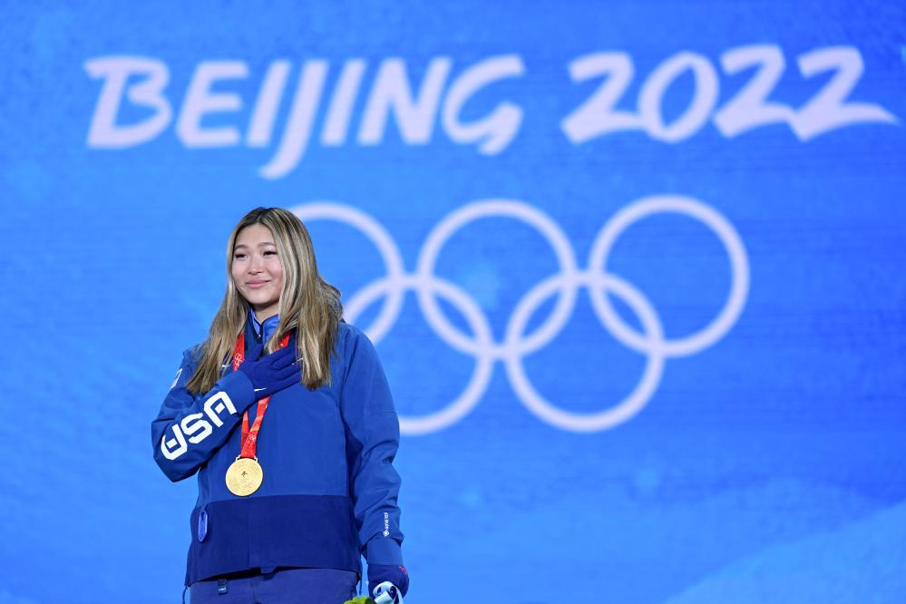 2022年2月10日,冠軍美國選手克洛伊·金在北京2022年冬奧會單板滑雪女子U型場地技巧獎牌頒發儀式上。新華社記者 戴天放 攝