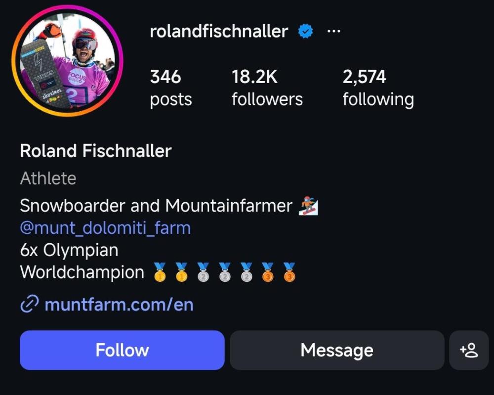 “放牛老哥”并不是一句玩笑,而是一份正經的工作。在自己的個人社交賬號主頁上,菲施納勒這樣介紹自己:“Snowboarder and Mountainfarmer”。前面的snowboarder不難理解——單板滑雪運動員;而所謂“mountainfarmer”,是阿爾卑斯山區常見的一種職業,指長期在山區從事農牧業及相關經營的人,俗稱“山地農牧民”。