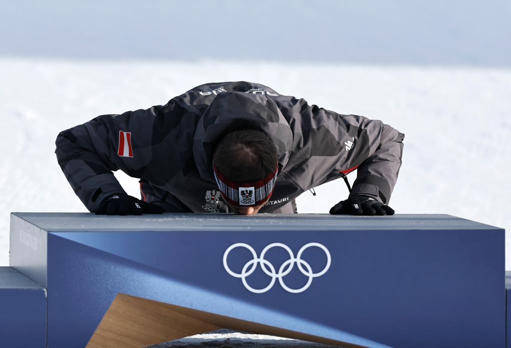 2月8日,冠軍奧地利選手本亞明·卡爾在頒獎儀式上親吻領獎臺。新華社記者 王鵬 攝
