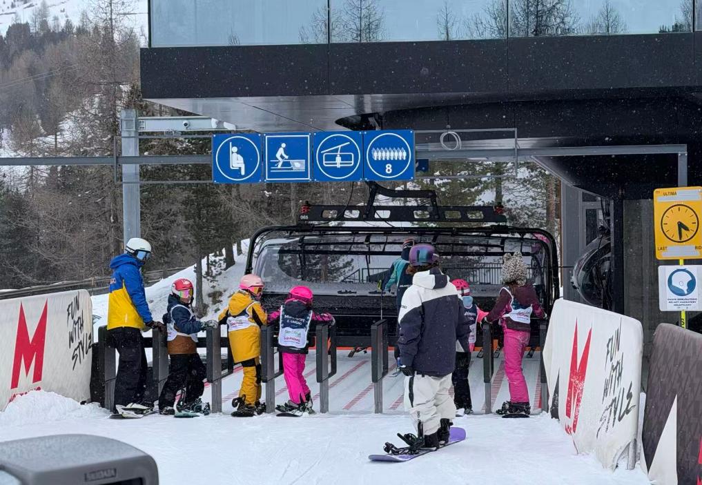 我隨“雙板初學(xué)組”抵達(dá)山下纜車站后,工作人員立即調(diào)慢運(yùn)行速度,并協(xié)助維持上車秩序。從嫻熟度來看,這就是他們的日常工作場景。由于該組小朋友眾多,我擔(dān)心采訪會影響安全,所以決定去人數(shù)相對較少的“雙板競技組”看看。