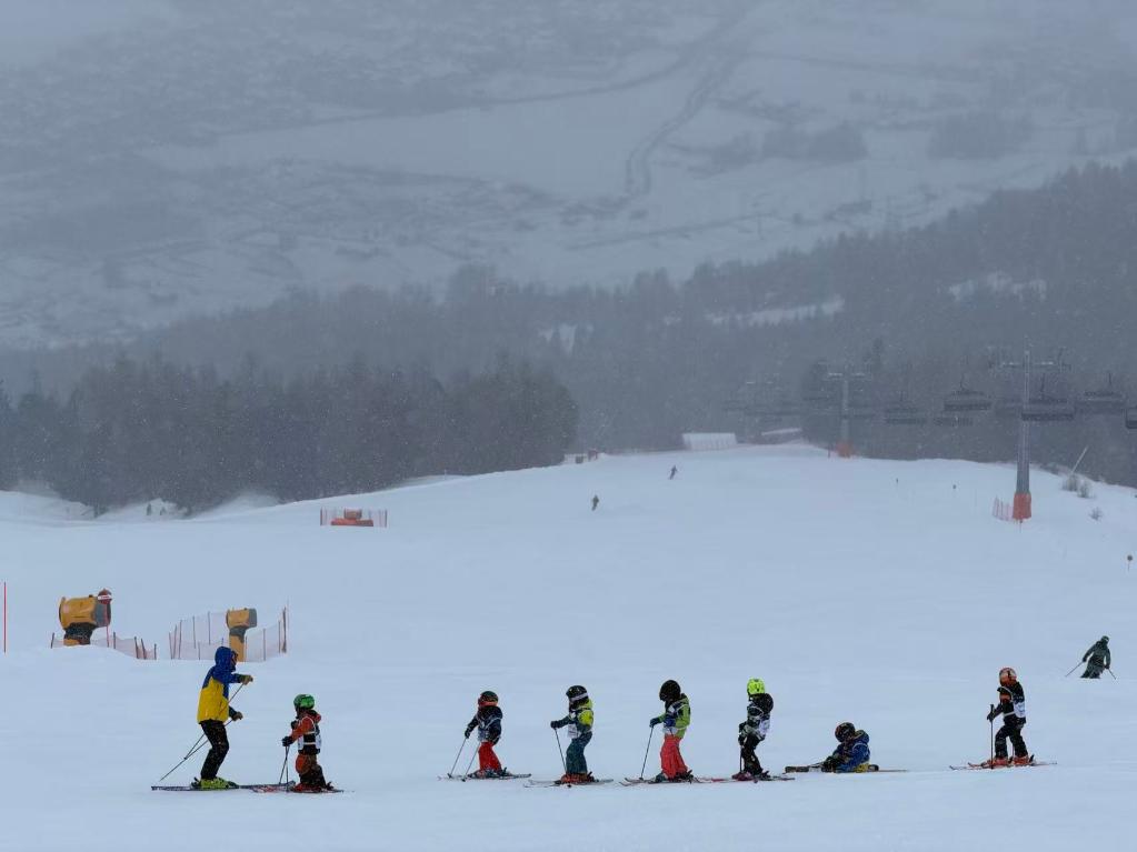 利維尼奧的小學(xué)生正在上滑雪課,山下背景為冬奧會賽場