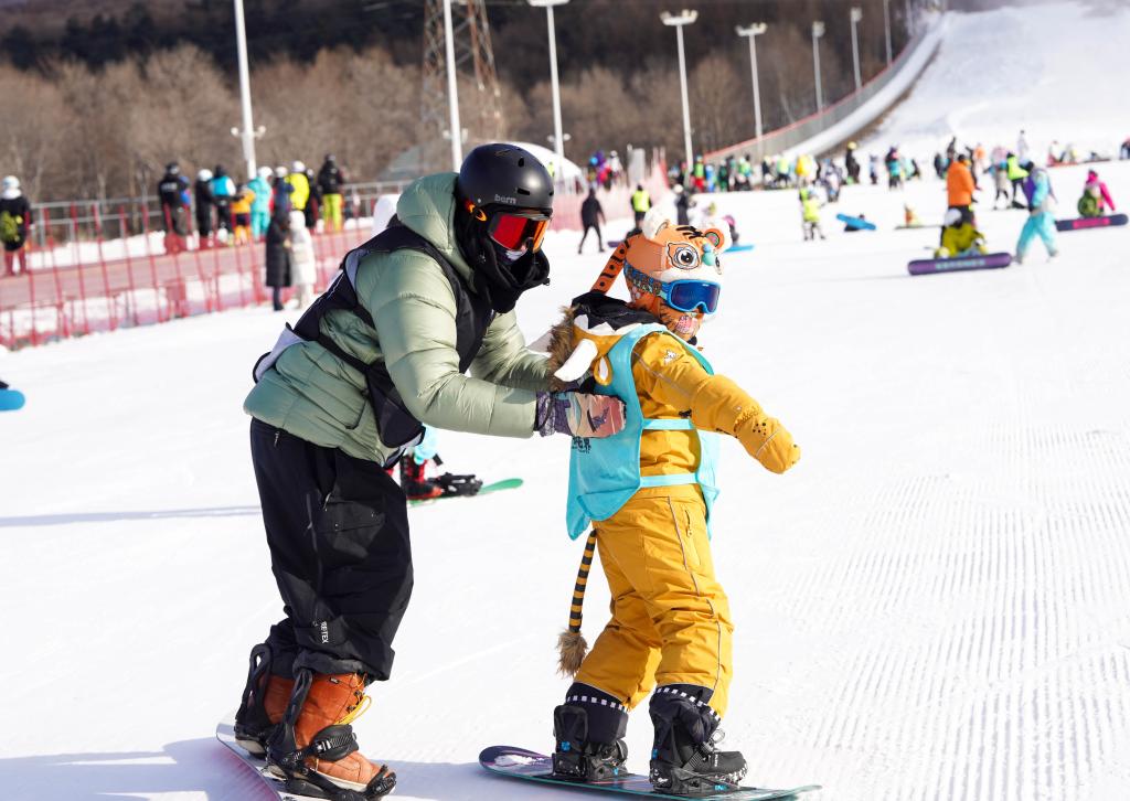 2025年12月3日,吉林市中小學生在“冰雪假期”期間,在吉林市納美山谷度假區體驗單板滑雪。新華社記者 顏麟蘊 攝