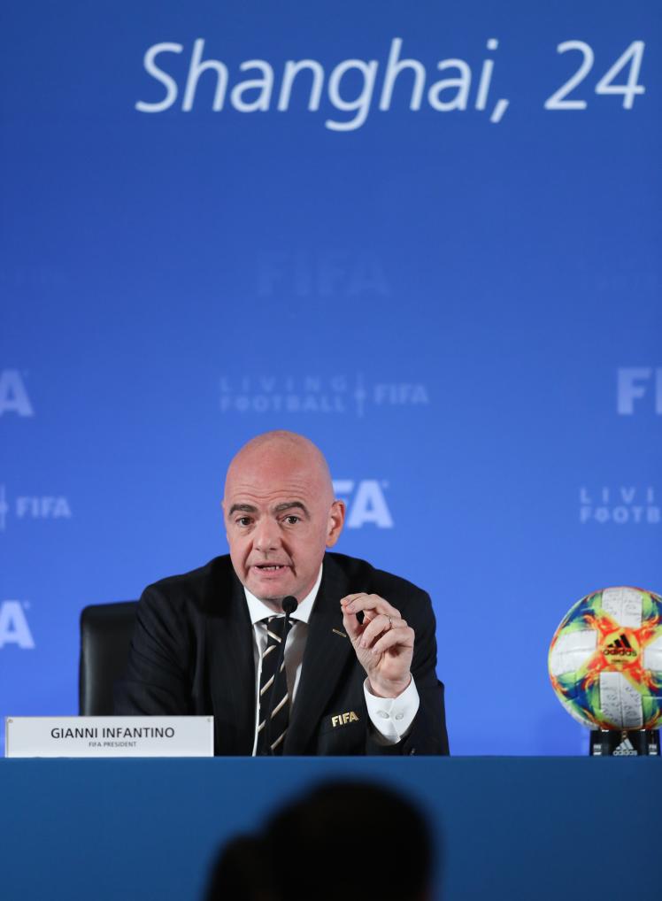 資料圖:2019年10月24日,國際足聯主席因凡蒂諾在上海舉行的國際足聯理事會新聞發布會上講話。新華社記者 丁汀 攝