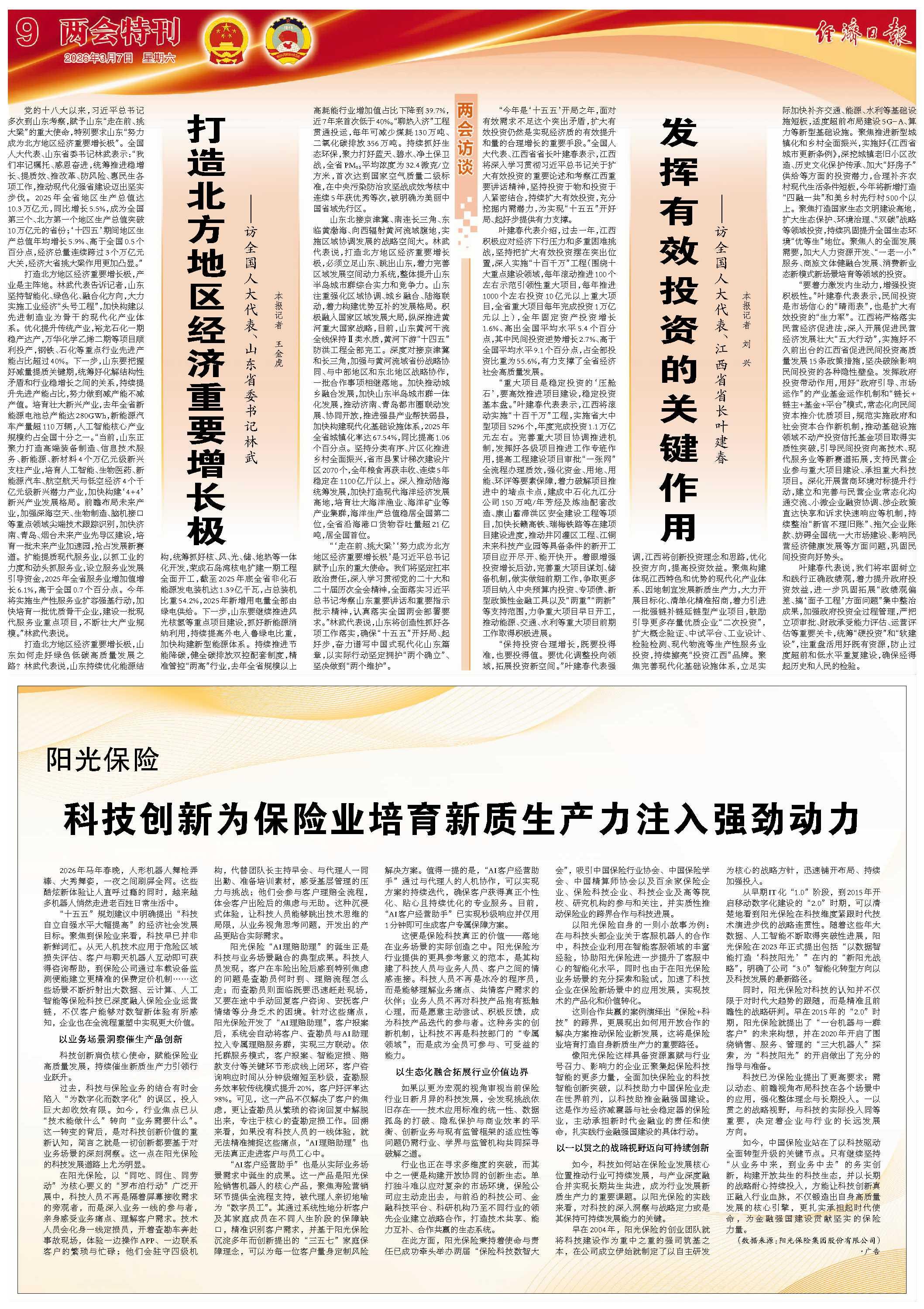 打造北方地區經濟重要增長極,產業是主陣地。林武代表告訴記者,山東堅持智能化、綠色化、融合化方向,大力實施工業經濟“頭號工程”,加快構建以先進制造業為骨干的現代化產業體系。優化提升傳統產業,裕龍石化一期穩產達產,萬華化學乙烯二期等項目順利投產,鋼鐵、石化等重點行業先進產能占比超過40%。下一步,山東要把握好減量提質關鍵期,統籌好化解結構性矛盾和行業穩增長之間的關系,持續提升先進產能占比,努力做到減產能不減產值。培育壯大新興產業,去年全省新能源電池總產能達280GWh,新能源汽車產量超110萬輛,人工智能核心產業規模約占全國十分之一?!爱斍?,山東正聚力打造高端裝備制造、信息技術服務、新能源、新材料4個萬億元級新興支柱產業,培育人工智能、生物醫藥、新能源汽車、航空航天與低空經濟4個千億元級新興潛力產業,加快構建‘4+4’新興產業發展格局。前瞻布局未來產業,加強深??仗臁⑸镏圃?、腦機接口等重點領域尖端技術跟蹤識別,加快濟南、青島、煙臺未來產業先導區建設,培育一批未來產業加速園,搶占發展新賽道。擴能提質現代服務業,以抓工業的力度和勁頭抓服務業,設立服務業發展引導資金,2025年全省服務業增加值增長6.1%,高于全國0.7個百分點。今年將實施生產性服務業擴容強基行動,加快培育一批優質骨干企業,建設一批現代服務業重點項目,不斷壯大產業規模。”林武代表說。