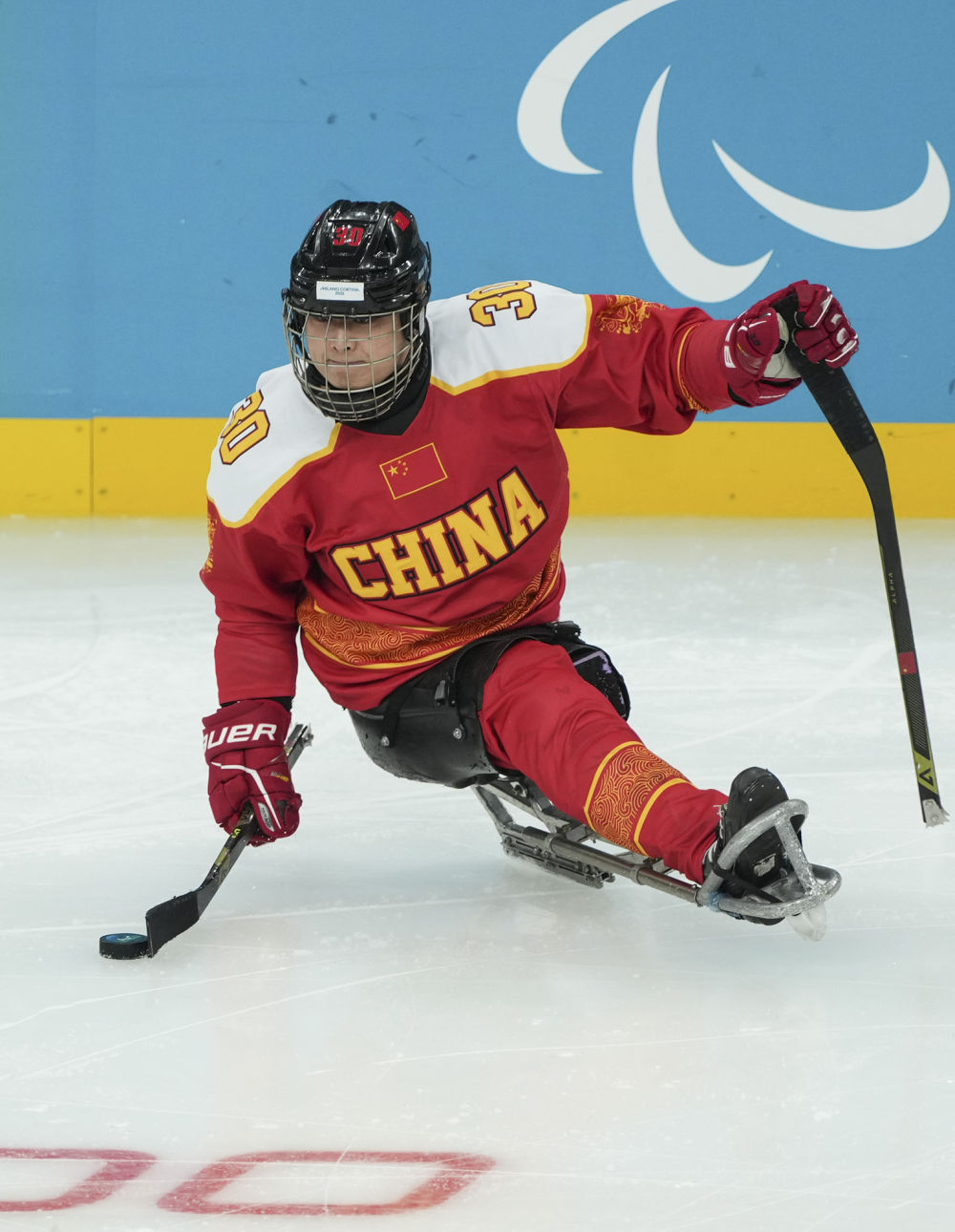 3月9日,在意大利米蘭舉行的米蘭-科爾蒂納冬殘奧會殘奧冰球小組賽A組比賽中,中國隊11:1戰勝意大利隊。圖為中國隊球員邱殿棚在比賽中控球。新華社記者 侯俊 攝