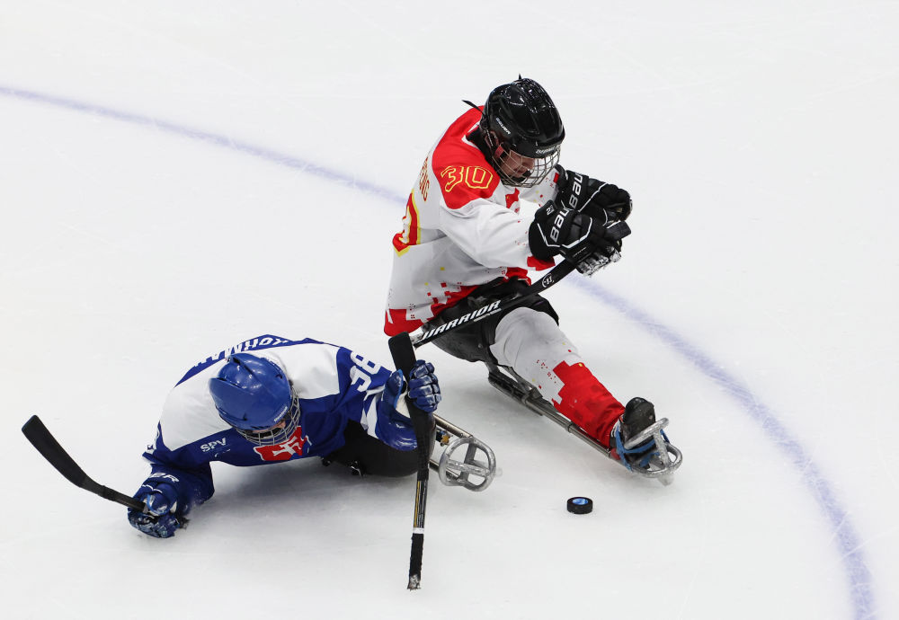 2022年3月5日,在國家體育館舉行的北京冬殘奧會殘奧冰球小組賽中,中國隊以7:0戰勝斯洛伐克隊。圖為邱殿棚(右)在比賽中拼搶。新華社記者 張可任 攝
