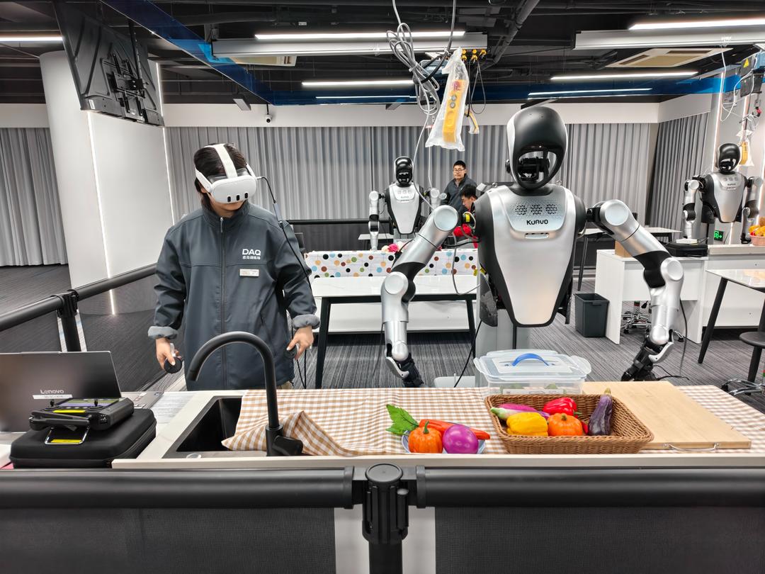 今年1月,青島市人形機(jī)器人數(shù)據(jù)采集訓(xùn)練場在此啟用。整層室內(nèi)環(huán)形訓(xùn)練場被錯落切割為廚房、商超、汽車制造等7個實(shí)景,每塊置景內(nèi)均有1—2位真人“老師”,耐心地“手把手”教導(dǎo)31個名為夸父的機(jī)器“學(xué)生”。