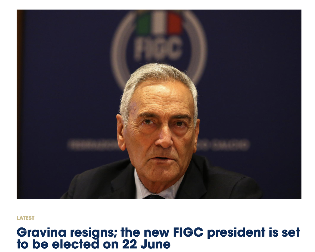 格拉維納在2018年當選意大利足協主席,并于2021年成功連任。在他的任期內,意大利隊在2021年贏得歐錦賽冠軍,但未能晉級2022年和2026年世界杯決賽圈。新一任意足協主席將于6月22日產生。