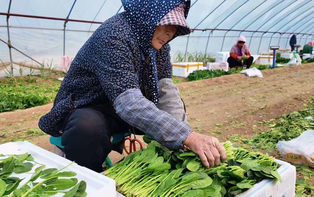 4月3日,在淄博市高青縣黑里寨鎮的山東昊瑞農業科技發展有限公司的大棚里,一畦畦菠菜鮮嫩喜人。農戶們手腳麻利地割下菠菜,修掉老葉、捋凈毛根,再把長短齊整的菠菜一棵棵碼進泡沫箱,等著送到消費者的餐桌上。