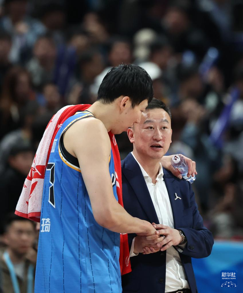 4月14日,青島嶗山啤酒隊主教練劉維偉(右)賽后與北京北汽隊球員周琦交談。