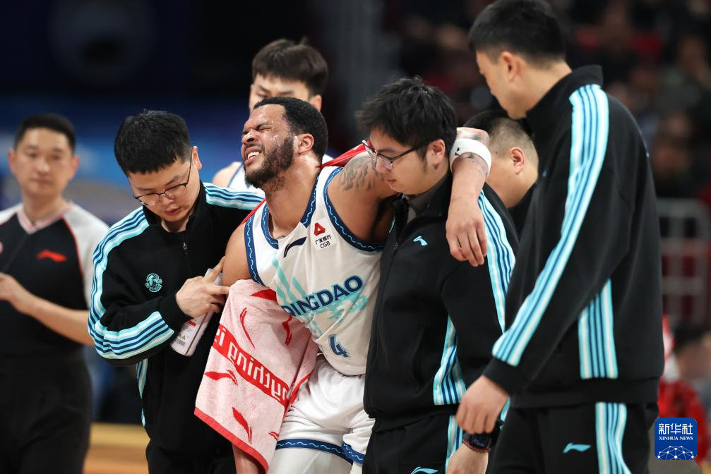 4月14日,青島嶗山啤酒隊球員韋瑟斯龐(中)在比賽中受傷后被攙扶下場。