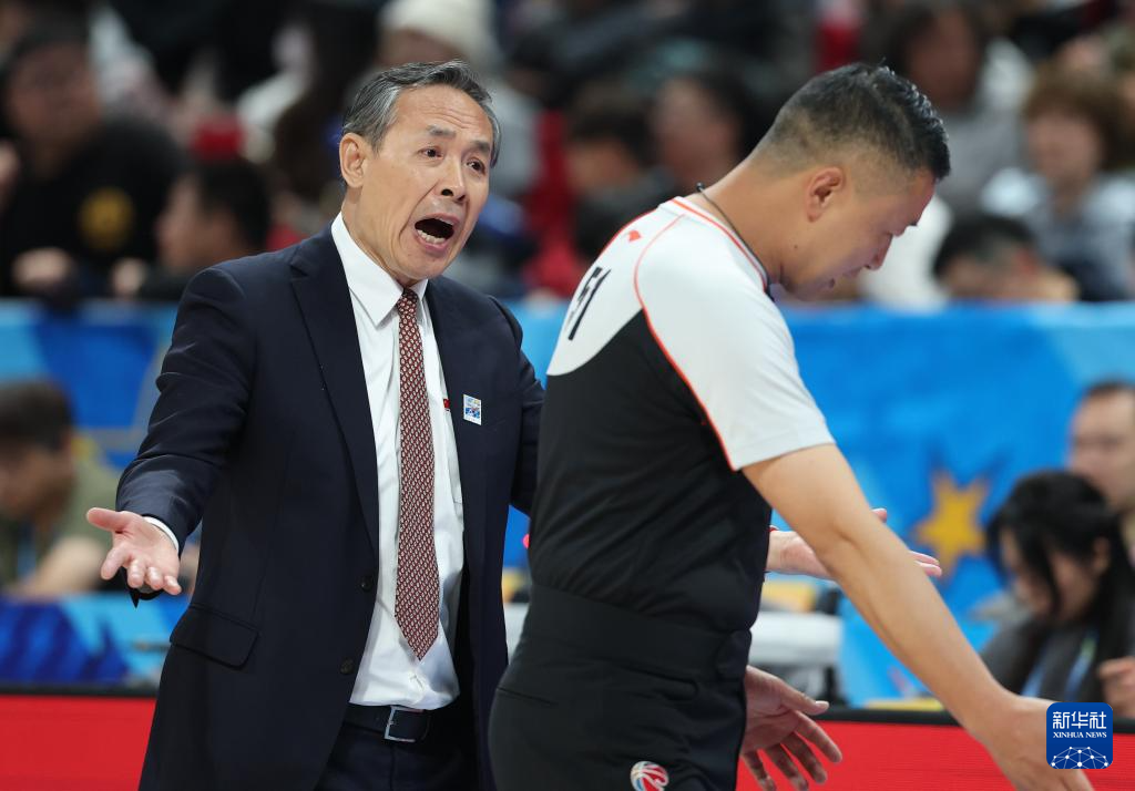 4月14日,北京北汽隊主教練許利民(左)對裁判判罰表示不滿。