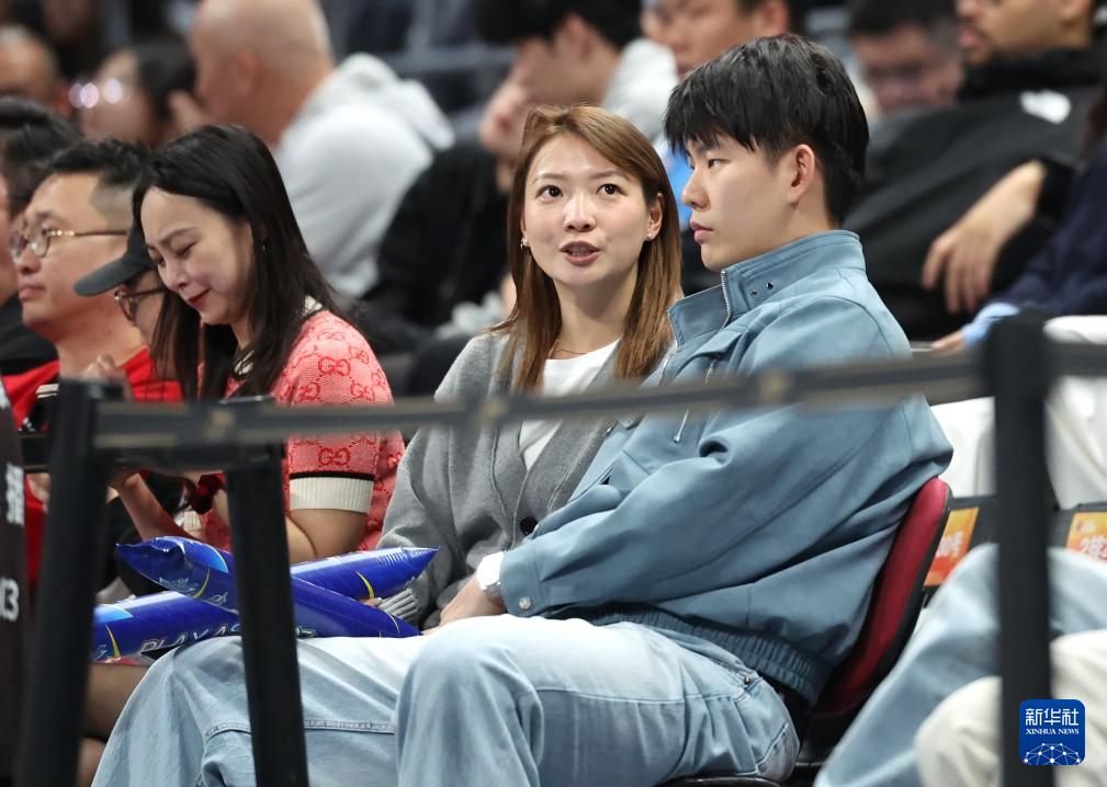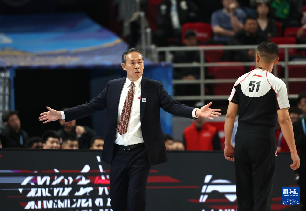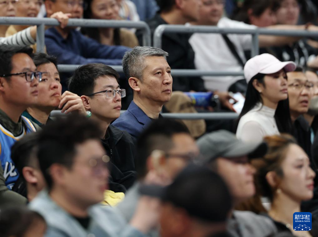 4月14日,中國國家男子籃球隊主教練郭士強(中)在看臺觀賽。
