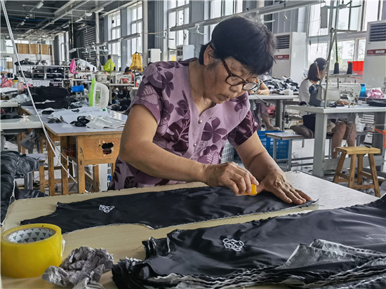 在南曹村服裝加工車間里,大量原材料與半成品之間設有工作臺,管理人員畢玉香說,車間主要接單進行品牌代加工。“主要讓村里的姐妹們有收入,為60余名村民提供了就業崗位。我們以做冬季服裝為主,出口到歐美、新加坡、澳大利亞、韓國等地。”畢玉香說。