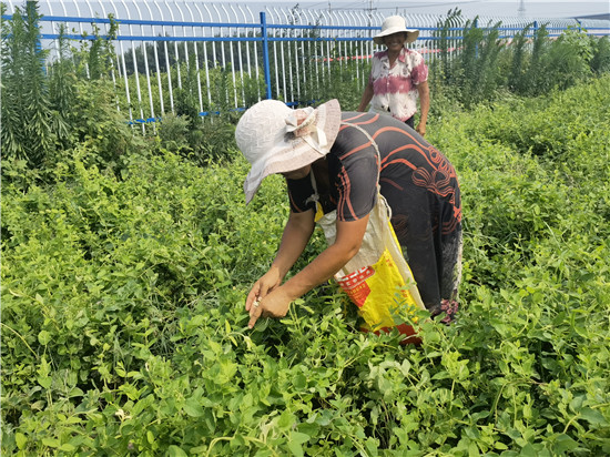 在地塊一端,村民楊梅等人一邊除草一邊采摘金銀花。她一邊麻利地薅起一把雜草扔到一邊,一邊介紹道:“我們幾個(gè)屬于長(zhǎng)期工,家就在陳屯村,公司按月給錢(qián),平時(shí)負(fù)責(zé)在公司旁邊的金銀花田里除草、摘花。這邊沒(méi)活的時(shí)候,我們就做自己家的農(nóng)活。”