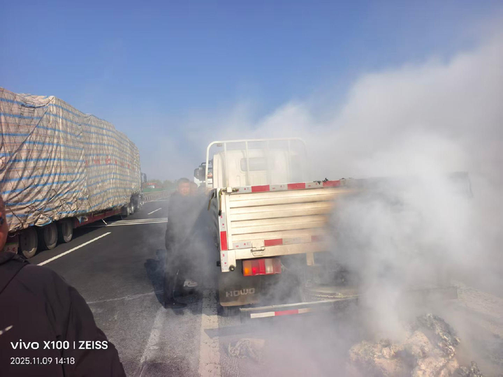 事情發生在11月9日上午,53歲的張憲良和董亞開著私家車,正趕往黃島看望朋友。當車輛行駛至日蘭高速距離莒縣服務區還有6公里處時,前方路面突然升起的滾滾濃煙打破了平靜。“老遠就看見黑煙沖天,走近了才發現是一輛小貨車在著火,火焰都躥到很高了。”張憲良回憶道,當時貨車的輪胎、車廂里的棉衣棉被都在燃燒,引擎蓋下方更是火光四射,隱約能看到油箱的位置,情況十分危急。