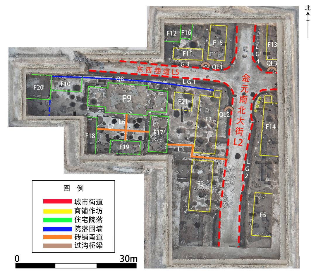 其中,在金元城市街道兩側,分布了若干處商鋪作坊類建筑,其室內分布多處用火跡象及大量冶煉鐵渣、碳屑灰燼,出土較多銅權、鐵權、錢幣、銅鏡及坩堝、銅把鍋等銅鐵質工具。其中,標號為“F14”的房址在擴建過程中還出現“侵街”現象,該建筑室外的灶、層狀分布鐵渣、水池則揭示了完整的生產活動流程。金元時期院落清晰,由多房址、道路、墻壁構成。其中標號“F9”的為院落正房,坐北朝南,由主房及東、西耳房、倒座房組成四合院布局,整體為高臺基建筑,方磚鋪地,出土龍首形套獸,規格較高。另設散水、排水明溝和暗渠,組成了院落完善的排水系統。作為住宅的四合院還與商鋪作坊圍合起來,形成兼具私密性與開放性的 “四合院+跨院”布局,即“前店后宅”的空間格局,體現商業經濟的影響,反映了當時穩定的社會環境、繁榮的手工業商品經濟。