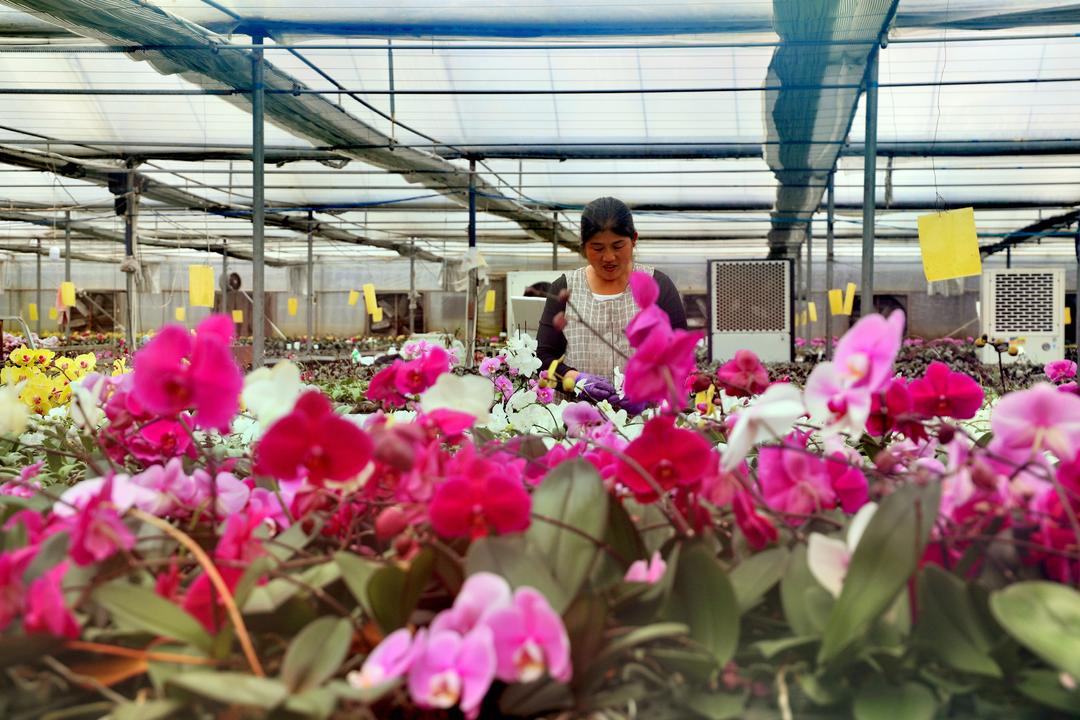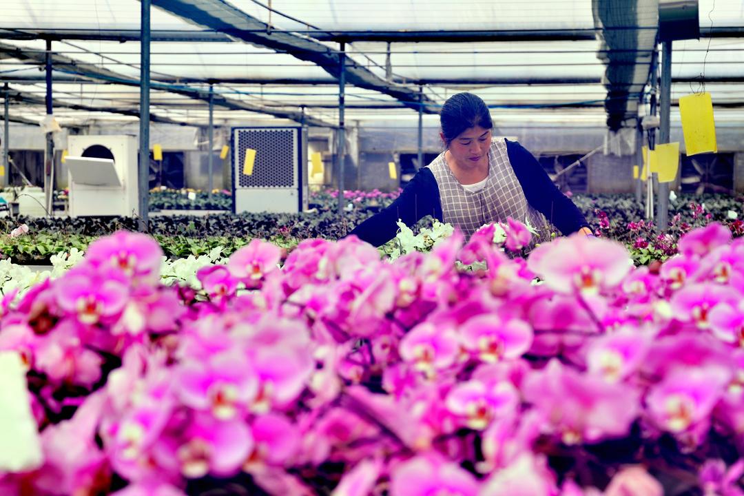 大棚里,粉白、玫紅的蝴蝶蘭亭亭玉立,工人們分工有序——有的給幼苗換盆,有的為盛開的花枝塑形。來自竇樓村的張艷玲正打理著一株“滿天紅”蝴蝶蘭,她笑著說:“中午管飯,一個月3000多塊,在家門口就能掙錢,還能照顧老人孩子?!?/p>
