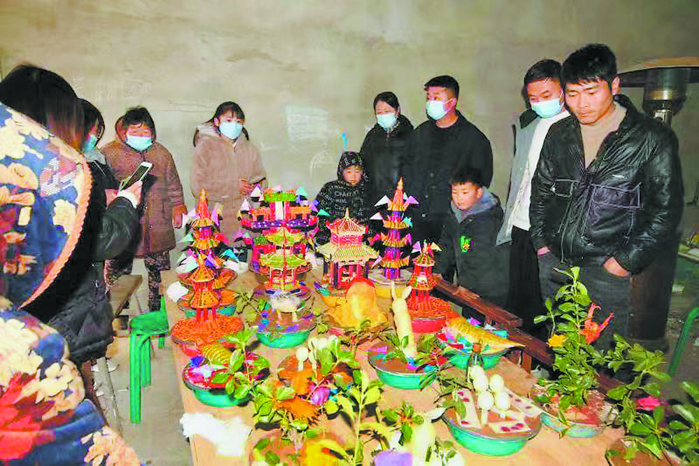 制作花供是一項(xiàng)非常辛苦的工作。通常情況下,以村各街道為單位,抽出熱衷于花供制作的男勞力組成制作小組,并選定一處臨時(shí)作坊,于正月初六晚上開始制作,直至初七凌晨,一桌花供經(jīng)過著色、擺放,才算制作完畢。