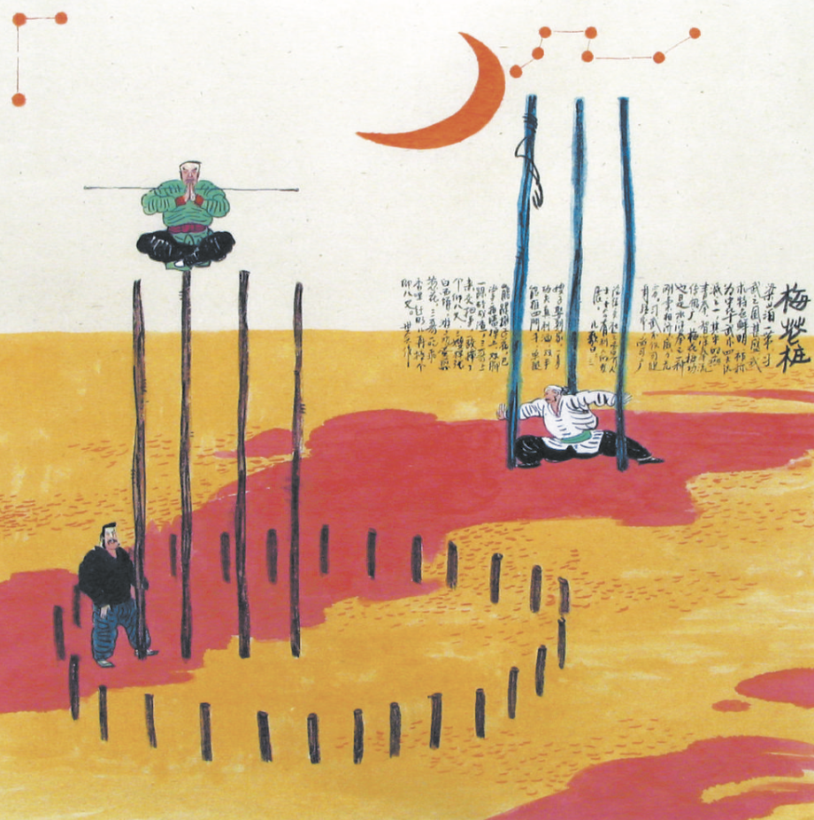 梅花樁是在空曠的地面上按一定的圖標(biāo)栽上的木樁,布樁講究上應(yīng)天象,下合地時,中合節(jié)氣,有“三星樁”“ 繁星樁”“ 天罡樁”“ 八卦樁”“ 五行樁”“ 九宮樁”等。木樁一般有碗口粗細(xì),矮的小腿一般高低,高的到人的腰胸,也有一人多高的,最適合集體練習(xí),眾人圍成一梅花狀,忽開忽合,收放自然。在梅花樁上行走,很考驗人的功力,功夫不夠的人根本上不去樁,更別提在上面站樁行走了。