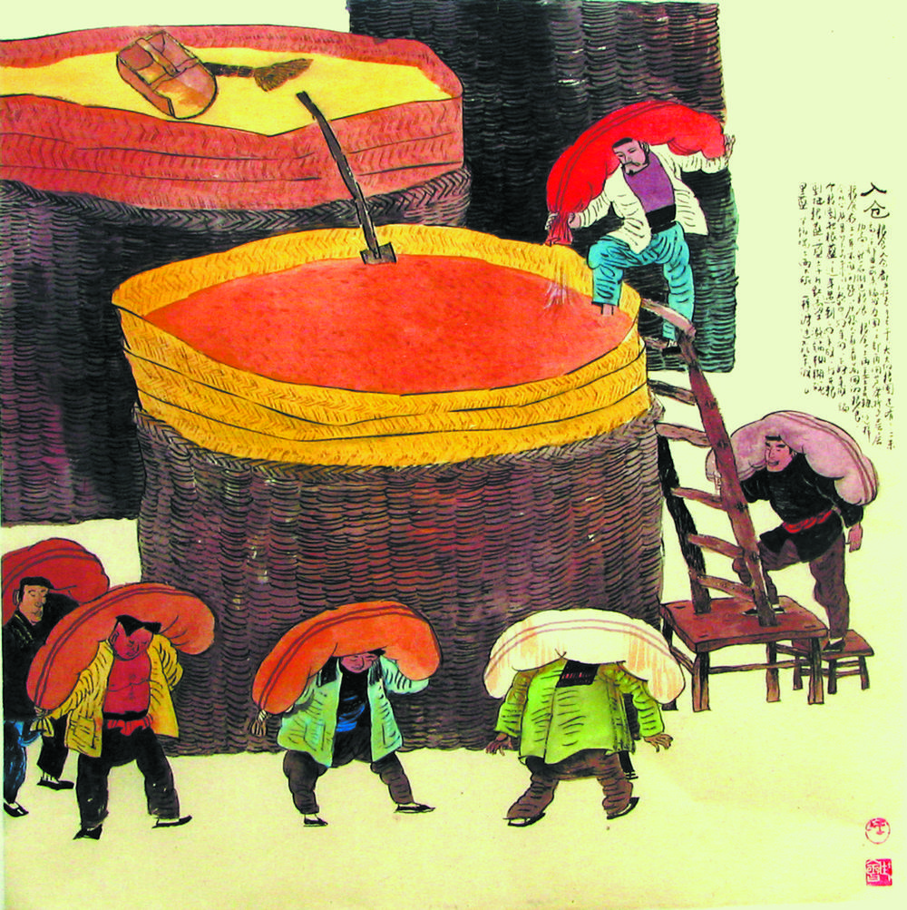 每當(dāng)糧食在場(chǎng)里打軋好了,再經(jīng)過(guò)晾曬完,裝進(jìn)了布袋,余下的便是由壯勞力扛布袋裝車,往囤里倒糧食了,這就叫入倉(cāng)。糧食入倉(cāng),可是個(gè)力氣活,也是壯漢們顯示自己力量的好時(shí)機(jī),大都由壯勞力去完成,大大的糧囤,足有二三米高,下部由荊條編成為囤,上部再用葦席折子層層加高,然后倒進(jìn)糧食,上面再蓋上麥糠防潮防蛀,這樣糧食便可存上一兩年不成問(wèn)題。一布袋糧食一般重一百多斤,袋高一米二以上,壯漢們用砍刀式、腰挎式、雙排式等架勢(shì)扛在肩上,以沉穩(wěn)快速的步伐,穿梭于場(chǎng)院與糧囤之間,博得人們一陣陣的贊嘆。