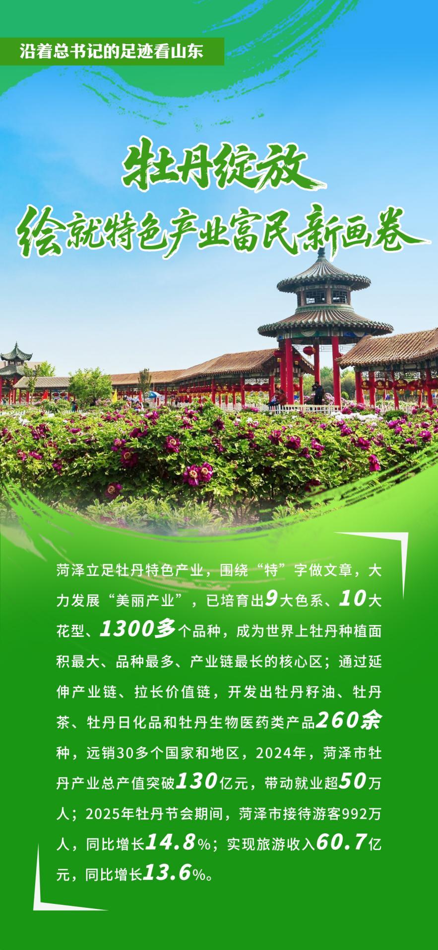 總書記的殷殷囑托,如明燈照亮前路,為菏澤依托特色資源發展牡丹產業指明了方向。十多年來,菏澤牢記囑托,圍繞“特”字精準發力,大力發展“美麗產業”,通過延伸產業鏈、拉長價值鏈、塑造文化IP,帶動牡丹產業從種植、種苗、切花、觀賞向醫藥化工、日用化工、食品加工、營養保健、文旅消費等領域延伸,讓菏澤牡丹“物盡其用”,走出了一條產業興旺、農民增收的特色發展之路。