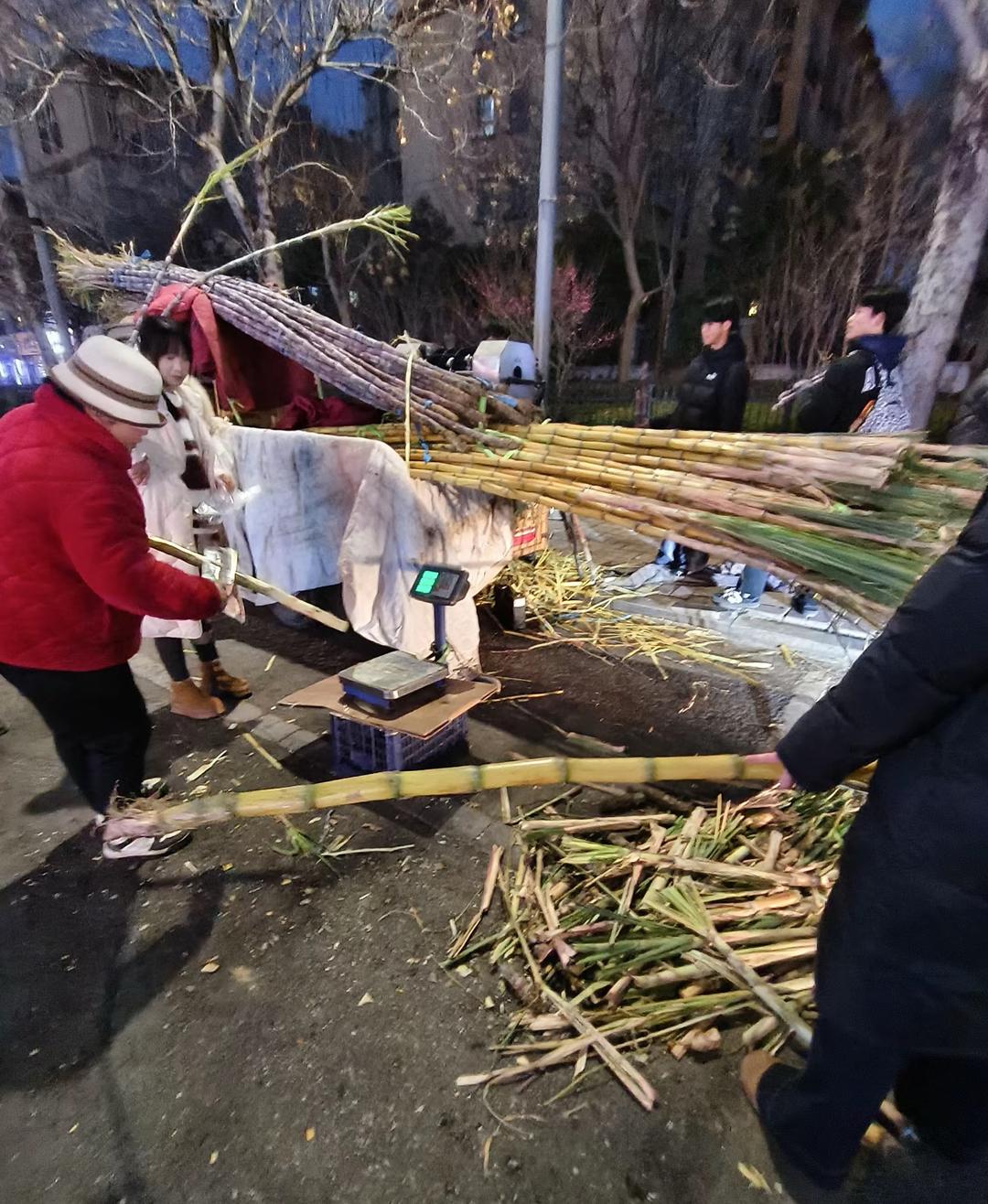 “昨晚來過,你已經收攤了,所以今天特意早點過來。”一位市民的話語,透著樸實的真誠。熱心人紛紛伸出援手,有人默默接過張傳站手中的砍刀,幫著砍甘蔗、稱重、搬運。對面火鍋店的員工,端來了熱騰騰的開水和飯菜,讓他暖手暖身,路過的商戶主動幫忙吆喝,維持秩序。