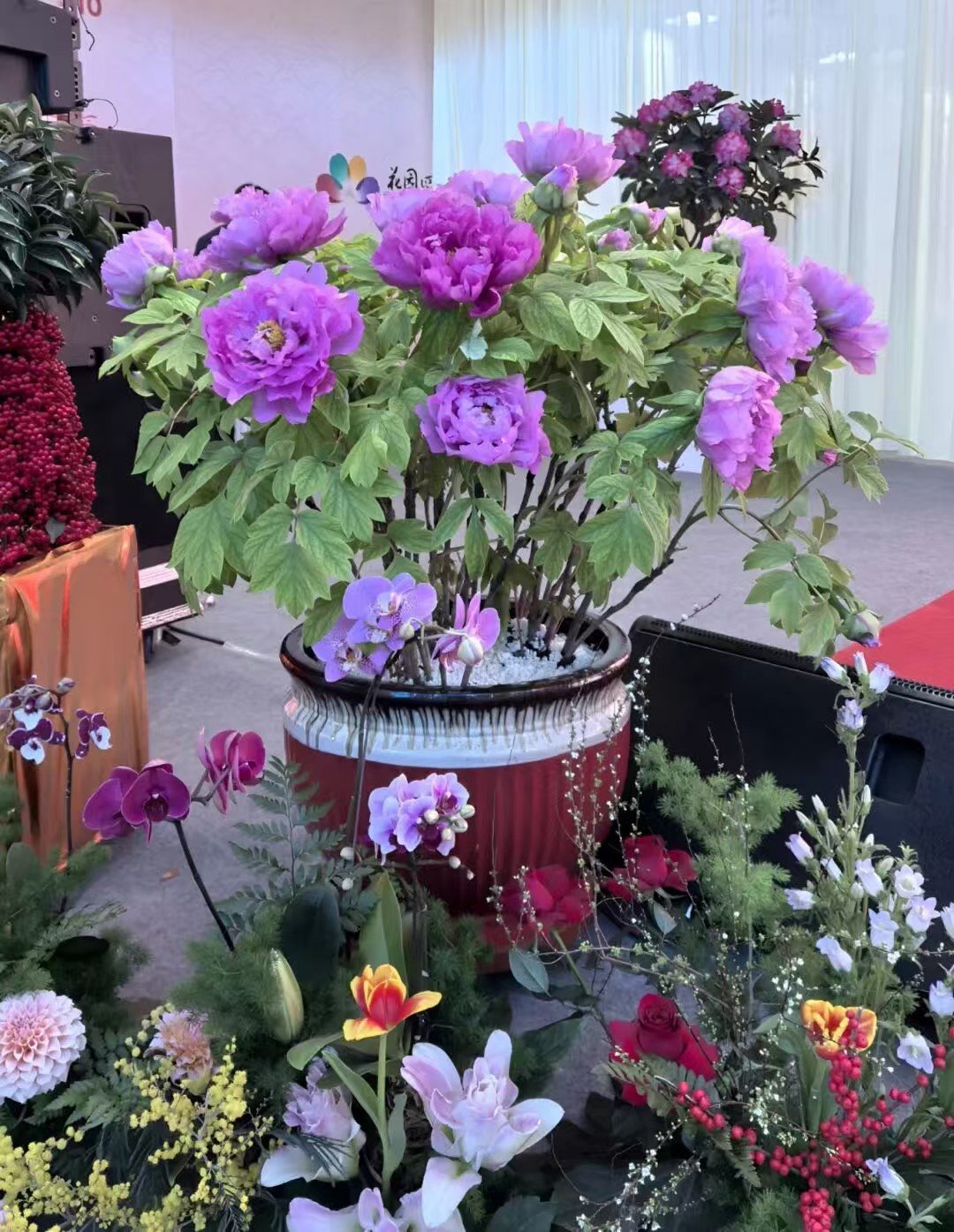 “我們此次參展的催花牡丹共200盆,包括烏龍捧盛、百園紅霞、玉面桃花、玫紅向陽、雪映桃花、紫二喬等20多個品種,均枝繁葉茂、花大色艷、生機勃勃。”菏澤誠美花木種植專業合作社總經理李洪勇介紹,他帶領工作人員于1月17日開始布展,展覽將持續至春節期間。雍容華貴的菏澤牡丹為北京市民奉獻了一場國色天香的視覺盛宴,也送上了濃郁的新春氣息。此次參展的牡丹植株圓滿、枝條粗壯、根系發達,花色涵蓋紅、粉、紫等,確保達到最佳觀賞效果。