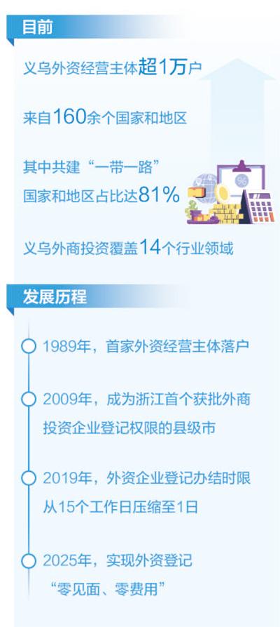簡化部分外國投資者外文材料,外國自然人憑外國人永久居留身份證即可辦理登記;推動外資登記全程網辦,外資企業登記辦結時限從15個工作日壓縮至1日……“從首家外資經營主體落戶義烏至今,義烏科學把關外商投資準入,深耕商事制度改革試驗田,積極做好外資經營主體培育工作,吸引外商來此投資興業。”義烏市市場監管局行政審批科科長陳群陽說。