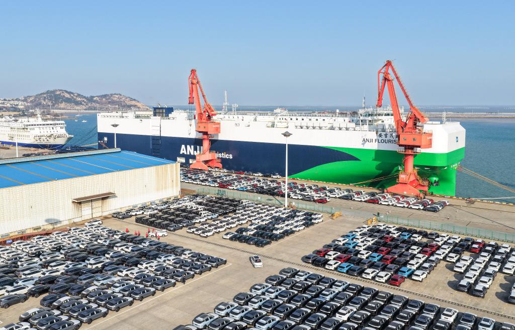 2025年12月17日,在江蘇連云港港,一艘滾裝船在裝運出口汽車(無人機照片)。新華社發(王健民攝)