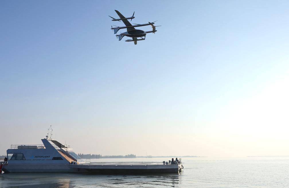 2025年11月22日,在江蘇昆山的峰飛航空全球科技日活動中,一架電動垂直起降飛行器從“水上機場”起飛。新華社記者 方喆 攝