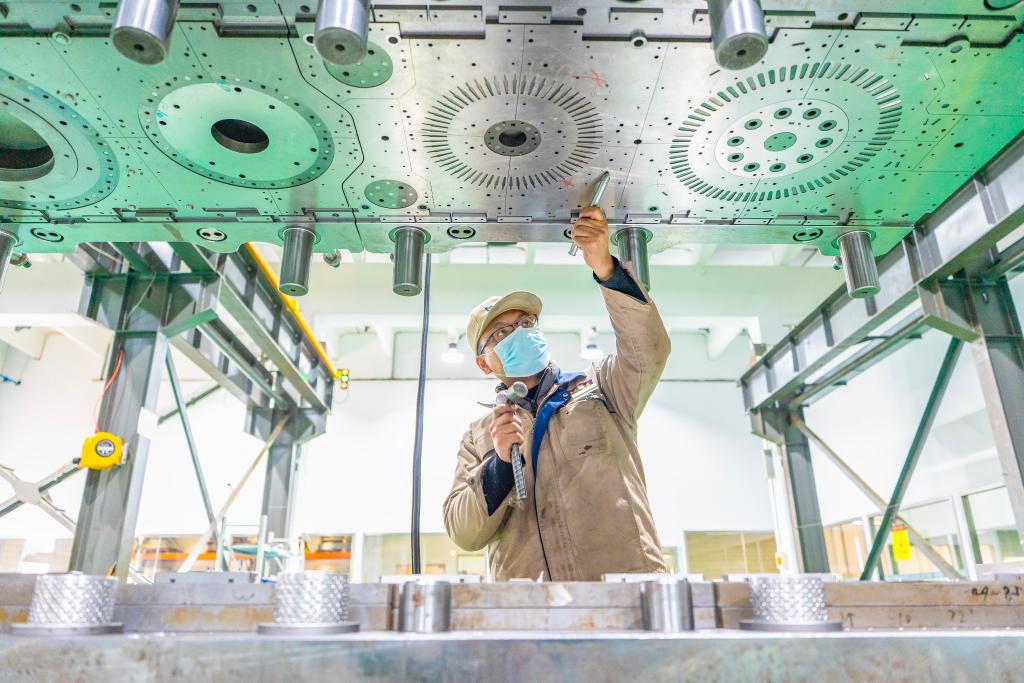 2025年12月15日,在位于江蘇省南通市通州區興仁鎮的江蘇富松模具科技有限公司車間內,工人趕制模具產品訂單。新華社發(翟慧勇攝)