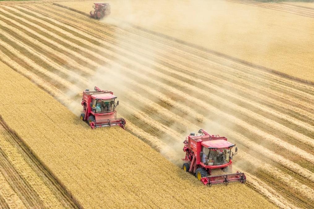 2025年6月9日,河南省三門峽靈寶市西閻鄉東古驛村村民在搶收小麥(無人機照片)。新華社發(杜杰攝)