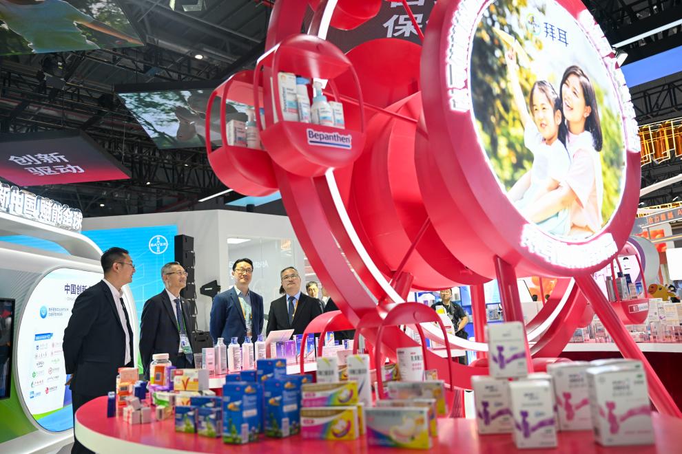 2025年11月7日,觀眾在進博會醫療器械及醫藥保健展區拜耳展臺參觀。新華社記者陳浩明 攝
