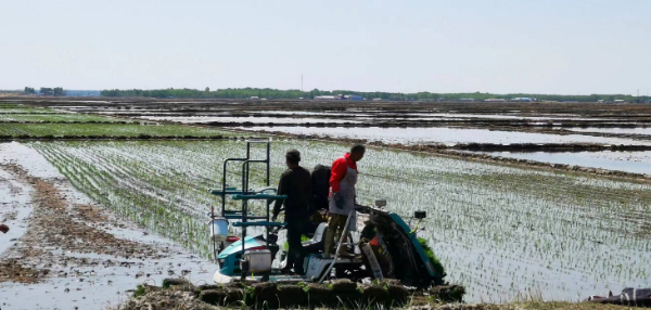 黑龍江省大慶市肇源縣新站鎮(zhèn)洪益糧食種植專業(yè)合作社的種植者正在實(shí)施覆膜插秧滴灌一體(2023年5月10日)