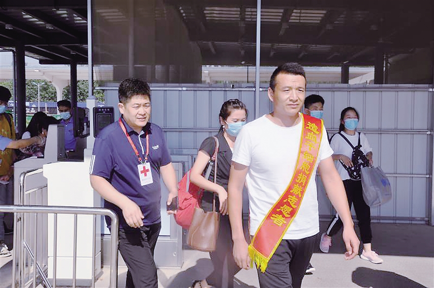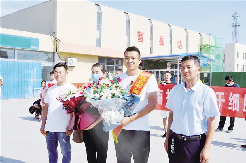8月26日下午3時,趙傳利在濟南成功捐獻造血干細胞后平安返回曹縣,在火車站受到了戰友和同學的熱烈歡迎。隨后,趙傳利所在的青菏街道專門為他舉行了歡迎儀式。