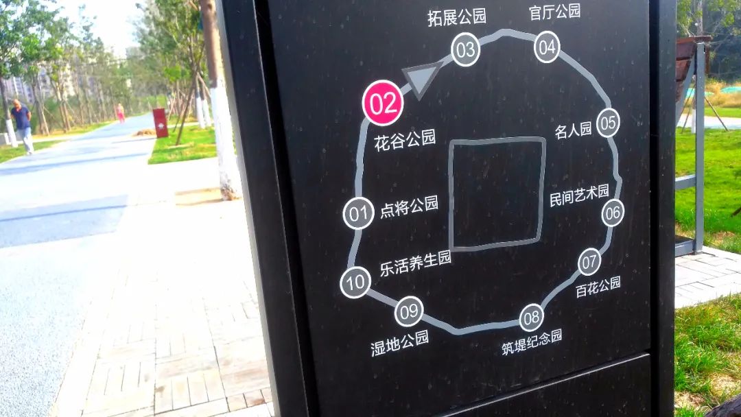 環堤公園十景分別為濕地公園、花谷公園、拓展公園、官廳公園、樂活養生園、百花公園,點將公園、筑堤紀念園、名人園、民間藝術園等;