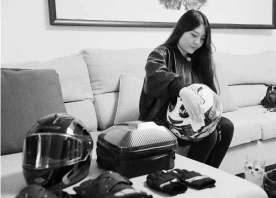 10月17日,在約定采訪的地點,蘇輝騎著一輛綠色的川崎牌摩托車飛馳而來,只見她身著一身黑色的專業騎行衣,戴著一頂酷炫的頭盔,英姿颯爽。而當她停車后把頭盔摘下時,一頭齊腰長發散落下來,突然讓這個又颯又酷的女孩安靜了下來。雖然已是兩個孩子的媽媽,但蘇輝看起來仍像一位少女,充滿了活力。