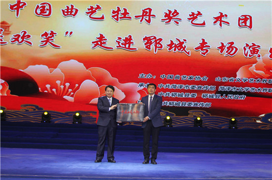 中國菏澤網(wǎng)消息 (通訊員 趙考壯 靳記偉 記者 鄭華偉) 11月14日,中國曲藝牡丹獎藝術團“送歡笑”走進鄆城專場演出暨鄆城縣“中國曲藝之鄉(xiāng)”授牌儀式和菏澤市創(chuàng)建“中國曲藝名城”啟動儀式在宋江武校狗娃劇場舉行,中國曲藝家協(xié)會分黨組書記楊發(fā)航向鄆城縣委副書記、縣長谷永強頒發(fā)鄆城縣“中國曲藝之鄉(xiāng)”牌匾。鄆城縣是山東省第二家授牌“中國曲藝之鄉(xiāng)”榮譽稱號的縣區(qū),活動中馮鞏、牛群、閆淑平、唐愛國等20余名曲藝名家分別在彭莊煤礦、宋江武校狗娃劇場為鄆城群眾獻上了精彩的文藝節(jié)目。