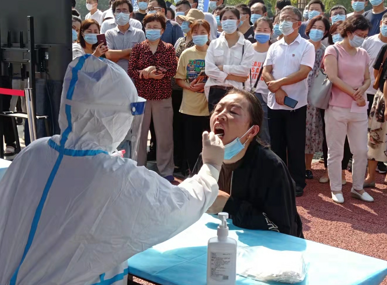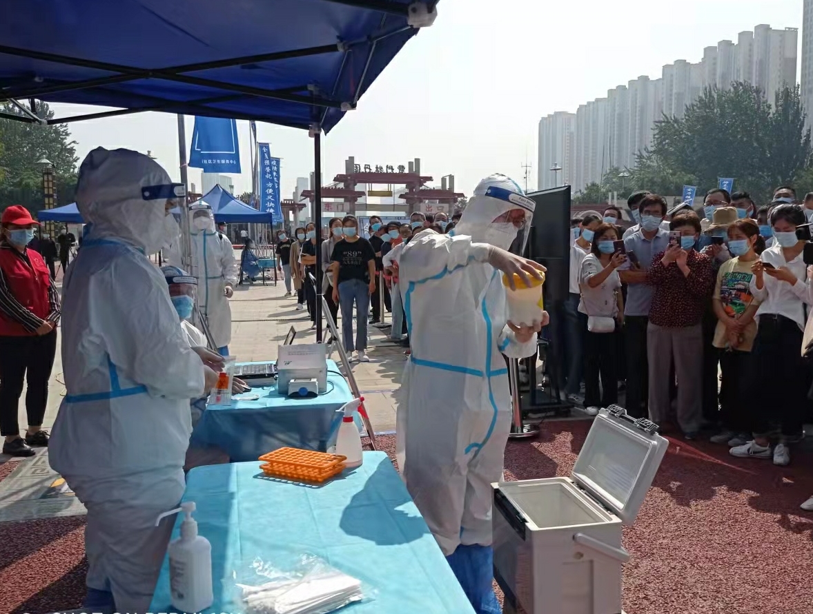 上午10時左右,演練開始,受檢人員持提前備好的健康碼,攜帶手機、本人居民身份證,佩戴口罩,保持1米安全距離排隊等候。然后,在工作人員引導下進行體溫測量,并登記個人信息。隨后醫務人員對居民采集咽拭子樣本,并負責樣品收集、包裝、核對、裝箱。樣本采集后,由醫務人員負責送檢,整個演練過程自然流暢、井然有序,達到了預期效果。