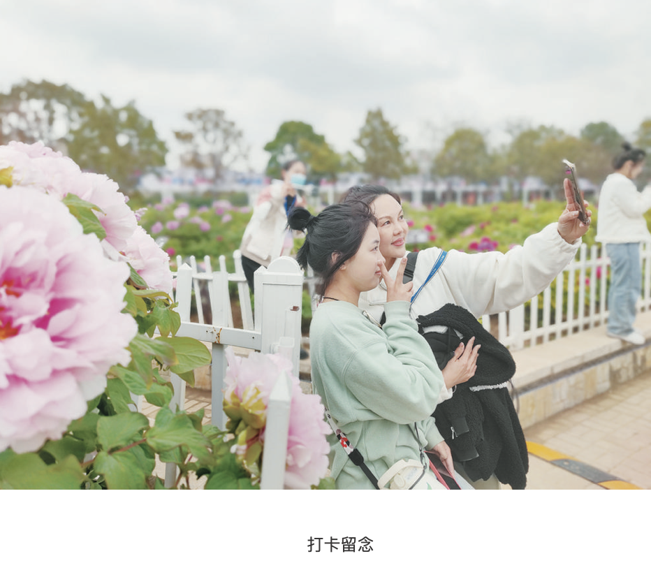 15時許,在百花園外,已經停滿了游客車輛,人們趁著春意,駐足觀賞綻放的牡丹花,感受國色天香。百花園以傳統稀有珍貴牡丹品種多,花色齊全,其中有世界上樹齡最長的牡丹花王,達600多歲,高盈丈,冠5米,花達400余朵,令人嘆為觀止。園內牡丹遍地開,在藍天白云的映襯下顯得繽紛嬌艷。
