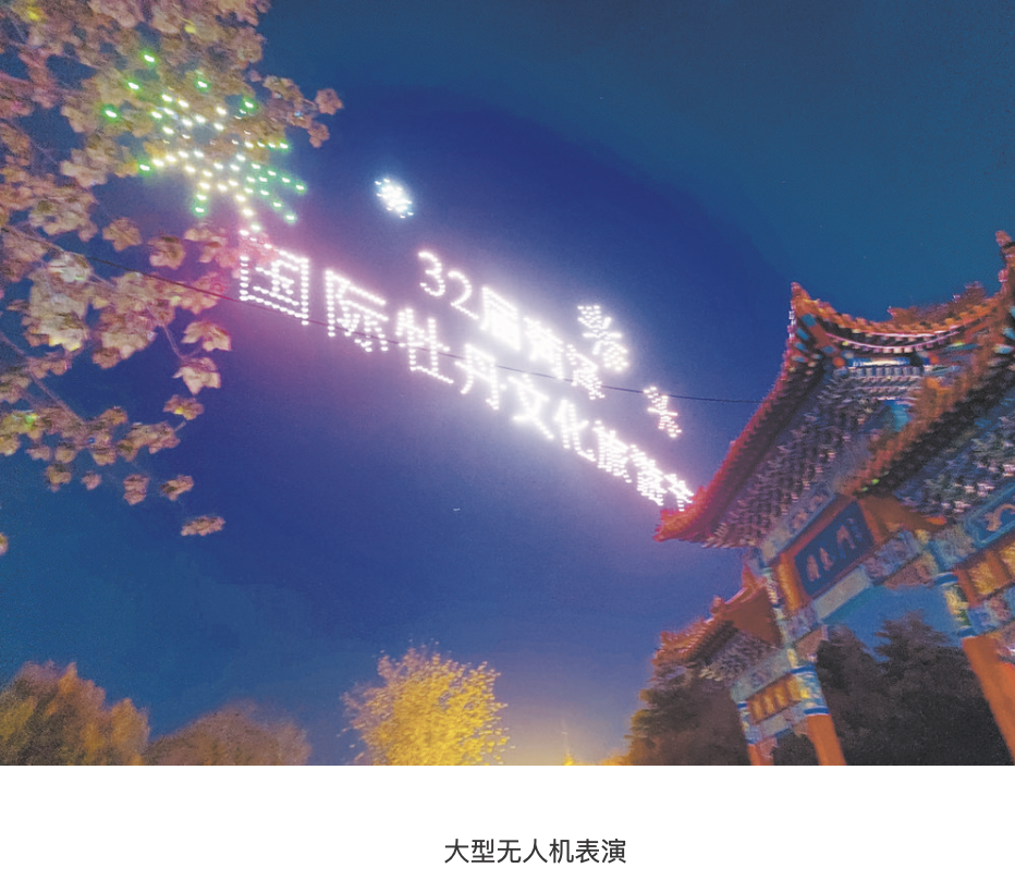 20時許,在曹州牡丹園,近千架大型無人機空中燈光秀震撼試演。“32屆菏澤國際牡丹文化旅游節”“中國牡丹之都 花樣菏澤”“愛菏澤 青春菏澤”……無人機燈光秀表演以天空為舞臺,利用燈光造景、3D等先進科技,配合音樂,在空中“勾勒”出眾多具有牡丹元素的圖案。