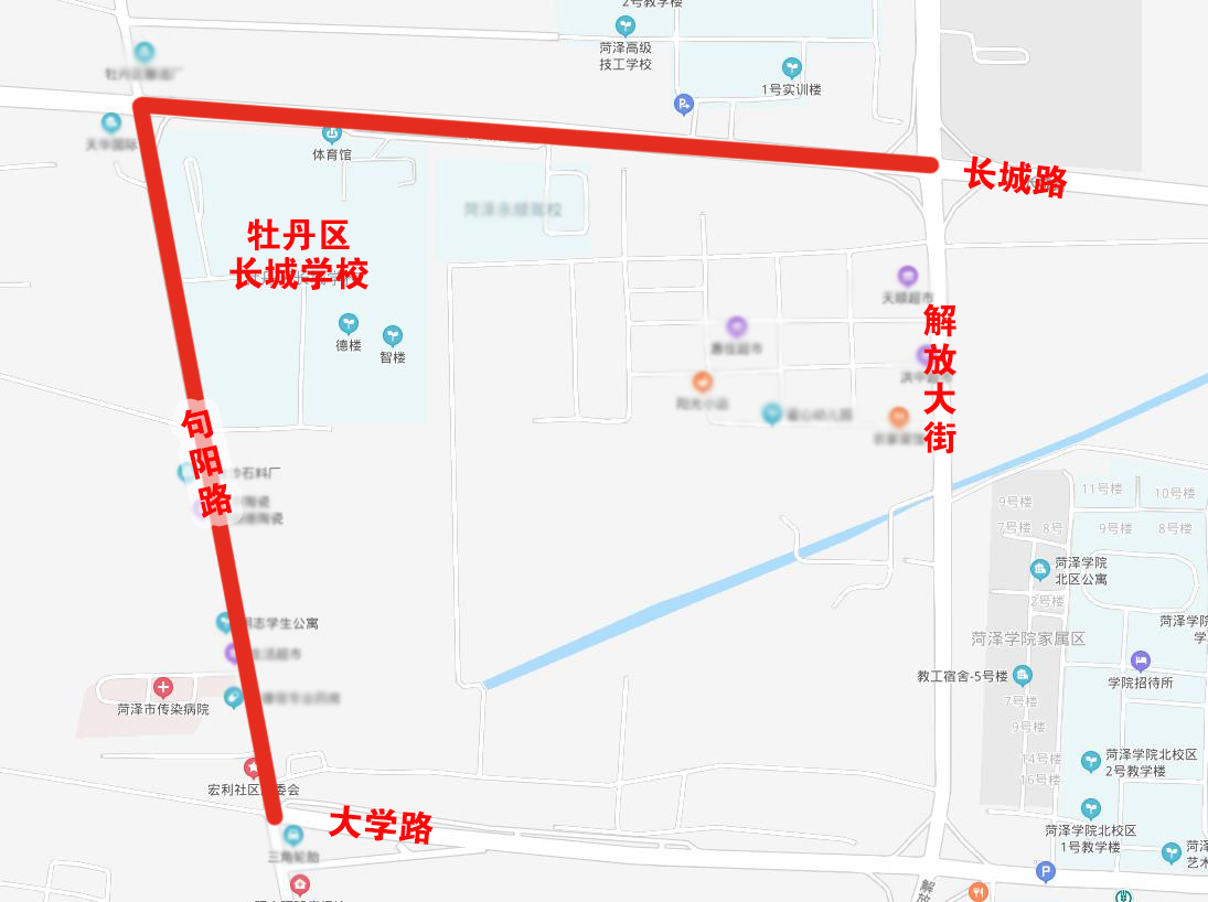 中國菏澤網消息(記者 馮 鍇) 牡丹晚報全媒體記者昨日從牡丹區交警大隊了解到,為給考生創造安靜的考試環境,高考考試期間,市區考場路段將實行交通管制(上圖紅色標注路段)。