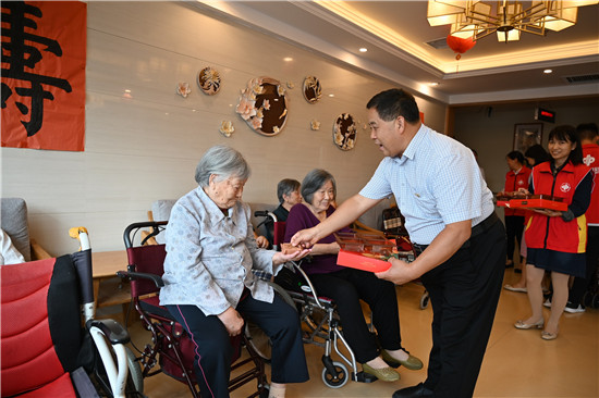 9月27日,菏澤市福利彩票銷售和管理中心主任馮相珍帶領部分黨員和志愿者,到菏澤市居家和社區養老服務示范中心開展志愿服務和慰問活動,為生活在這里的60位老人送去了月餅、牛奶等慰問品,并希望社會上更多的愛心人士關注老年人生活。 記者 馬 琳 攝