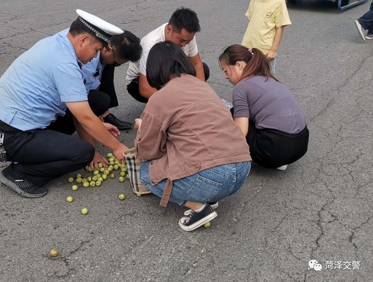 菏澤交警鄄城大隊民警恰巧巡查路過,見此情景立即下車適當干預交通,另有2名民警上前幫忙撿拾水果,交警的舉動也引來過往的其他路人參與幫忙,散落的水果很快得到撿拾,交通秩序得以快速恢復,民警的舉動受到過往群眾紛紛點贊。